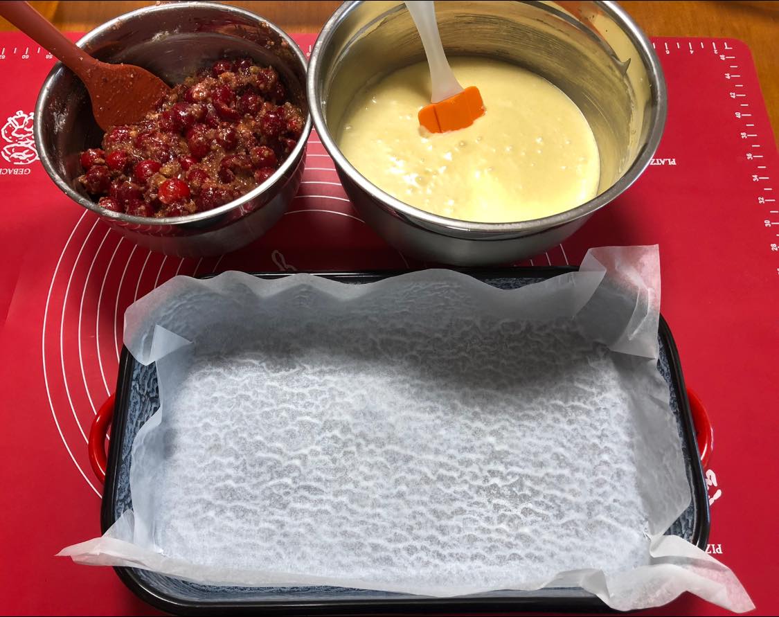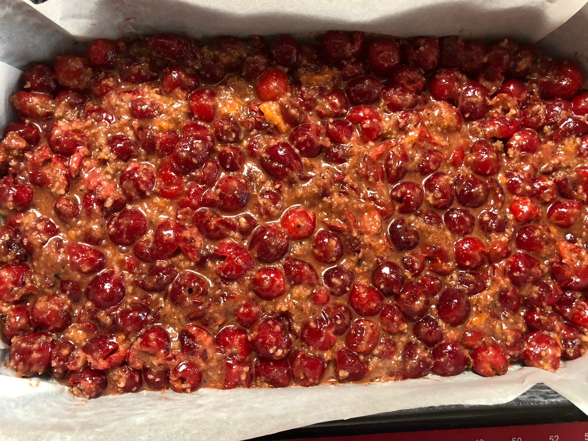 Θα στρωσουμε ένα ταψί με χαρτί ψησίματος και απλώνουμε γέμιση κεράσι. Ισοπεδώνουμε με ένα κουτάλι καλα.