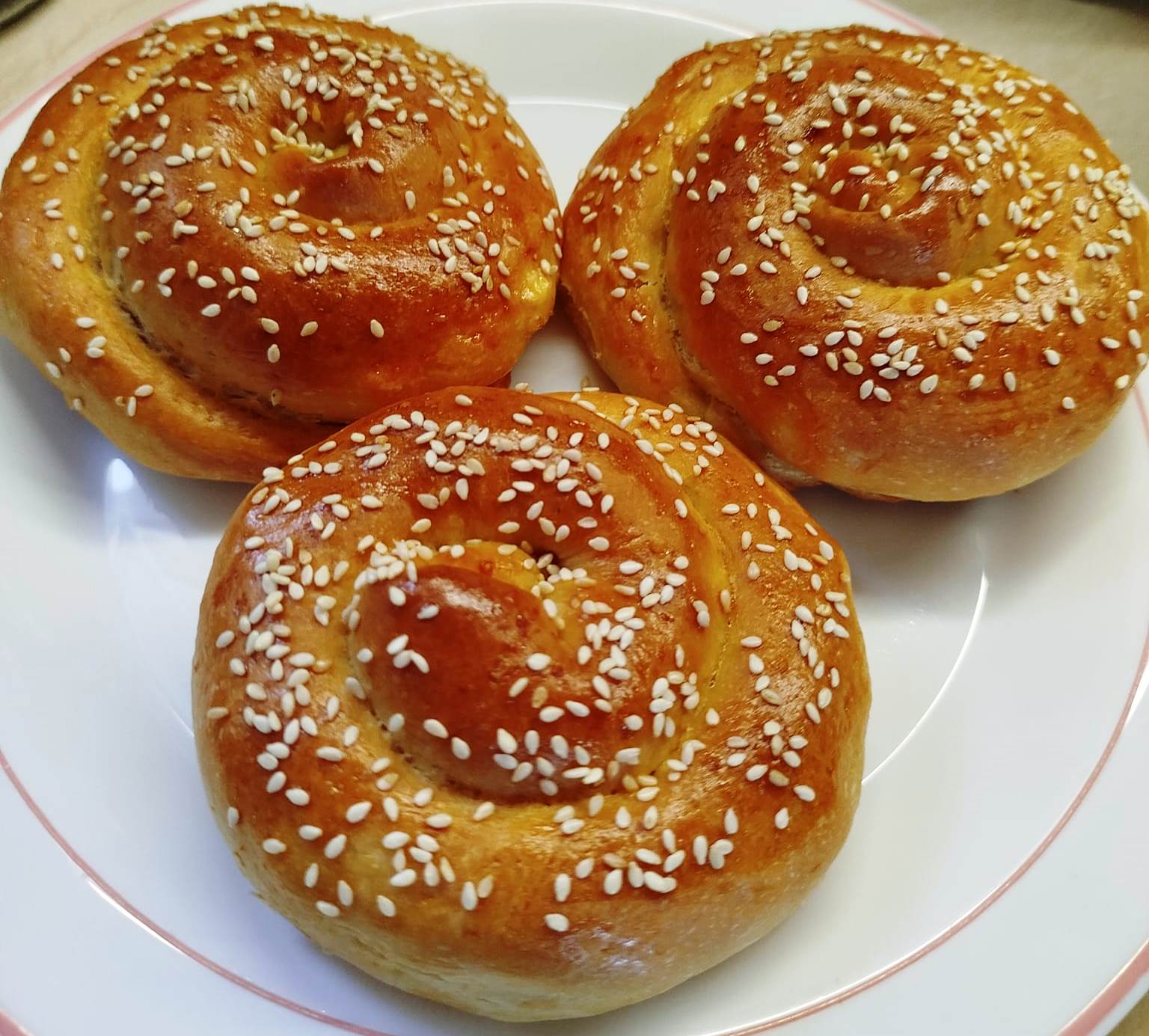 Ανακατεύουμε τα υλικά σε ένα μπολ κ πλαθουμε λίγο. Μαλακή ζύμη όχι παραπάνω αλεύρι από αυτό. Αφήνουμε να ξεκουραστεί μισή ώρα. Μετά χωριζουμε σε 8 μπαλάκια ανοίγουμε με λαδωμένα χέρια και βάζουμε μέσα ότι μας αρέσει το κλείνουμε σα ρολάκι το στρίβουμε σαλιγκαράκι αλοιφουμε με το κροκο κ ρίχνουμε σουσαμι. Φούρνο 190 βαθμούς μέχρι να ροδισουν.