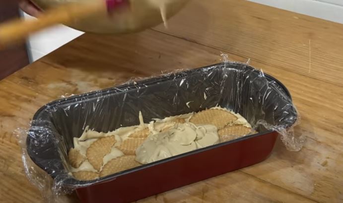 Στρώνουμε μια φόρμα μακρόστενη του κέικ με με μεβρανή τροφίμων και στρώνουμε μία βάση με την κρέμα και μετά στρώνουμε μια στρώση μπισκότα. Από πάνω ρίχνουμε άλλη μια στρώση με κρέμα.