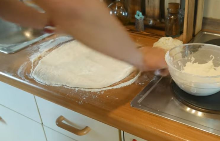 Χωρίζουμε την ζύμη σε 2 μέρη κα την ανοίγουμε σε ένα φύλλο περίπου 25 εκ.
