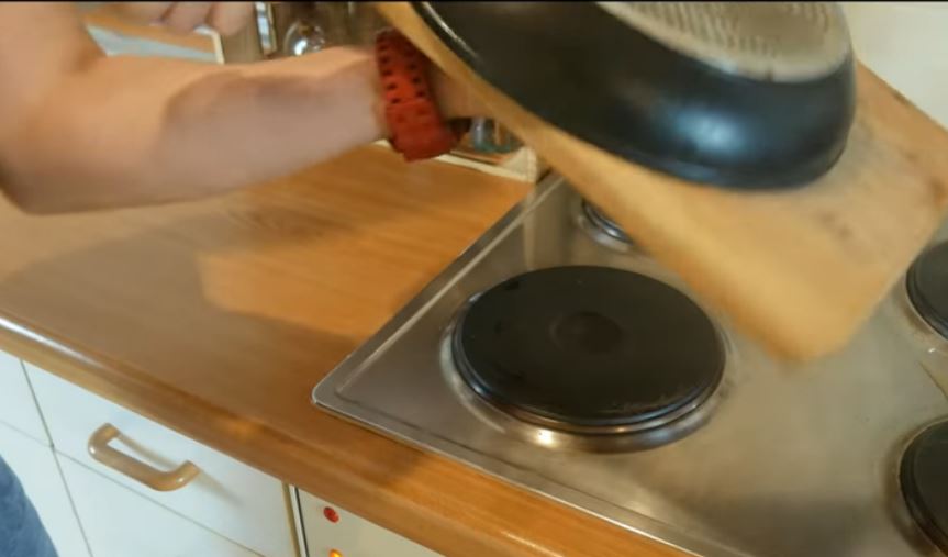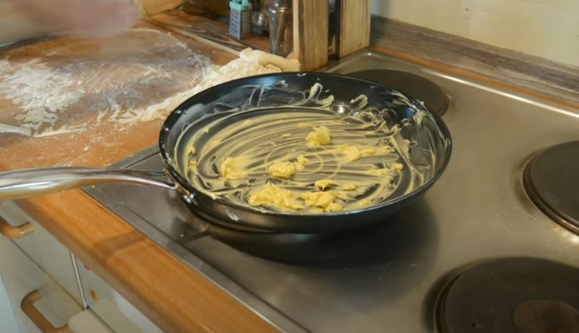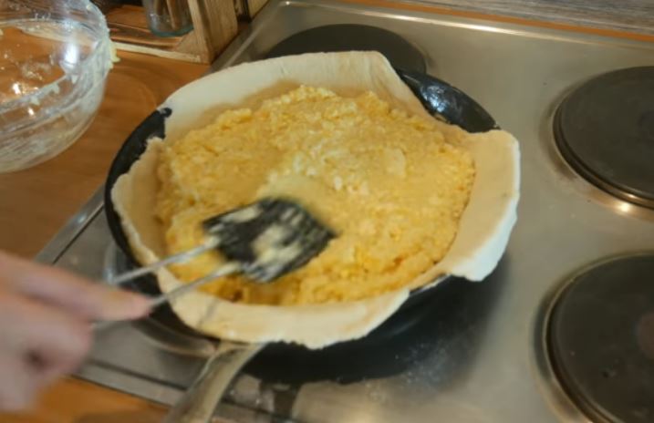 Ρίχνουμε το μείγμα στο τηγάνι και το απλώνουμε απο από το ζυμάρι.