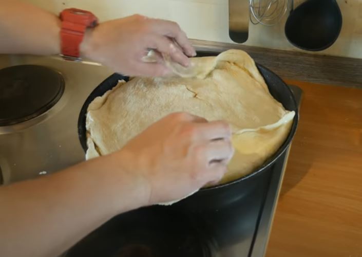 Ανοίγουμε το δεύτερο ζυμάρι και σκεπάζουμε το μείγμα στο τηγάνι.