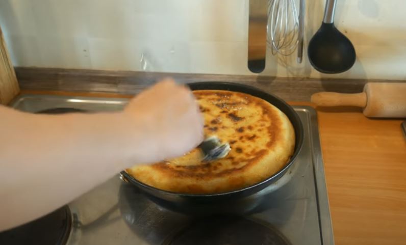 Ψήνουμε και μόλις πάρει χρώμα απο κάτω τοτε το γυρνάμε με την βοήθεια ένα μεγάλου πιάτου