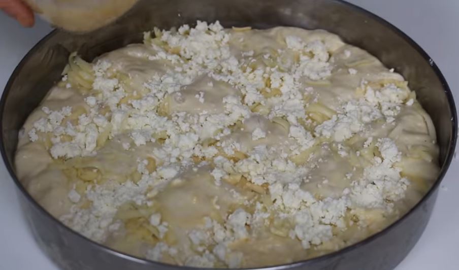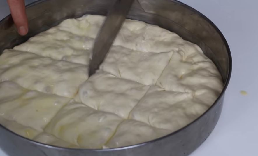 Χαράζουμε με ένα κοφτερό μαχαίρι την ζύμη σε κομμάτια και γεμίζουμε τις χαρακιές με τυρί τριμμένο κίτρινο και από πάνω φέτα ή ανθότυρο.