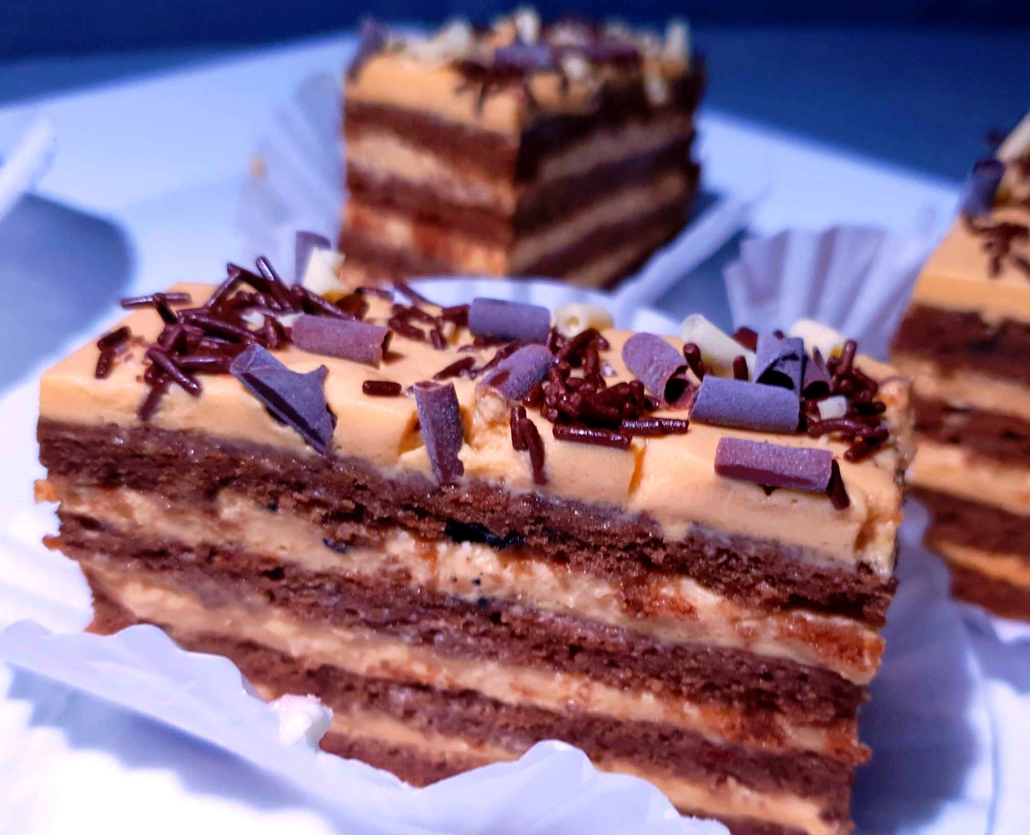 Το τυρί μασκαρπόνε ομογενοποιείται με μια σπάτουλα με την κρέμα καραμέλας από ζαχαρουχο γάλα. Χωριστά χτυπάμε την κρέμα γάλακτος για τη σαντιγί μέχρι να σφίξει καλά (προσοχή, η κρέμα για τη σαντιγί πρέπει να είναι πολύ κρύα, αλλιώς δεν θα γίνει σαντιγί). Προσθέστε το 1/3 της ποσότητας της σαντιγί και του εκχυλίσματος βανίλιας στο μείγμα μασκαρπόνε και κρέμας καραμέλας και ανακατέψτε με μια σπάτουλα. Ενσωματώνουμε ελαφρά την υπόλοιπη σαντιγί χωρίς να ανακατεύουμε κυκλικά (μόνο κατακόρυφα, από τον πάτο του μπολ στην επιφάνεια), για να πάρουμε μια αεράτη κρέμα, ξεκολλάμε το χαρτί ψησίματος από τις δύο κορυφές και χωρίζουμε το καθένα σε δύο μέρη ίσα, κόβοντάς τα με ένα μαχαίρι κάθετα στη μεγαλύτερη πλευρά. Διαλέξτε ένα φύλλο για τη βάση, τοποθετήστε και ισοπεδώστε το 1/4 της κρέμας πάνω του, στη συνέχεια σκεπάστε με το επόμενο φύλλο, πιέστε απαλά με τις παλάμες σας και επαναλάβετε μέχρι να εξαντλήσετε τις 4 στρώσεις από την κορυφή.