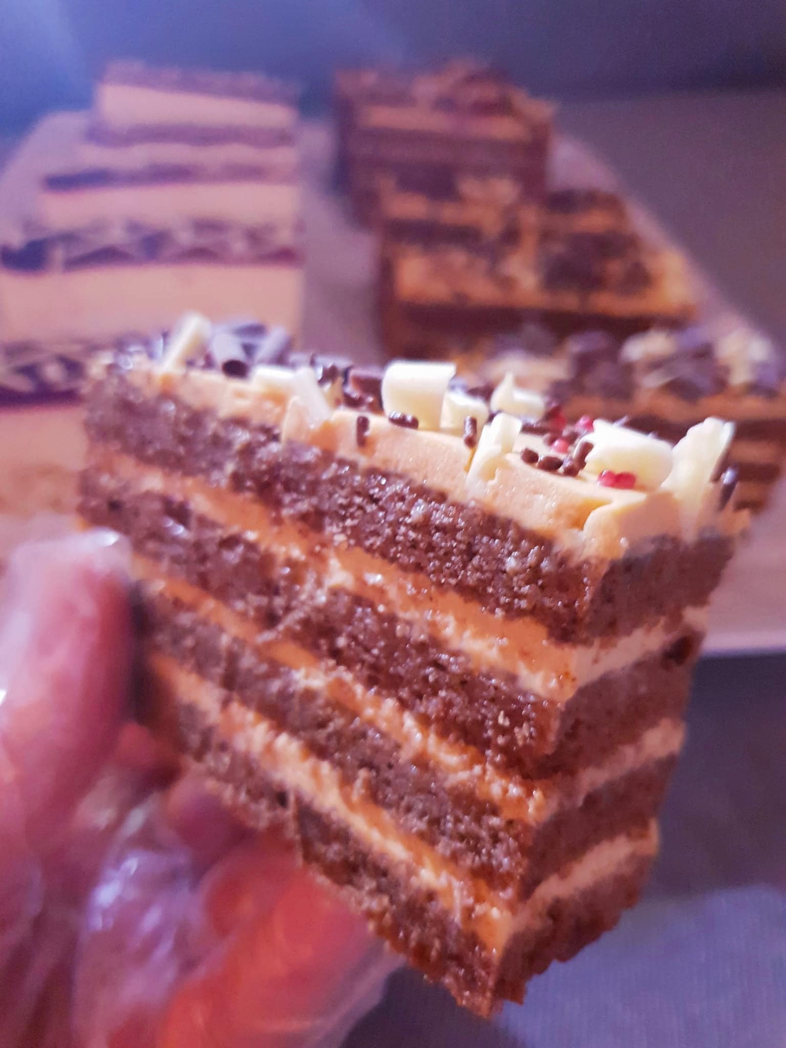 Το 1/3 της μαρέγκας αναμειγνύεται με το παραπάνω μείγμα κακάο, στη συνέχεια περιχύνεται με την υπόλοιπη μαρέγκα και ενσωματώνεται με κινήσεις από κάτω προς τα πάνω, για να ληφθεί μια αφρώδης σύνθεση. Μετά την ομογενοποίηση, μοιράζετε τη σύνθεση στα 2 ταψιά, ισοπεδώνετε και ψήνετε για 12-13 λεπτά στους 175 βαθμούς Κελσίου (αν έχετε λειτουργία αερα στο φούρνο, μπορείτε να ψήσετε και τα δύο φύλλα ταυτόχρονα). Αφού ψηθούν (μια οδοντογλυφίδα πρέπει να βγει καθαρή) αφήνουμε να κρυώσει καλά.
