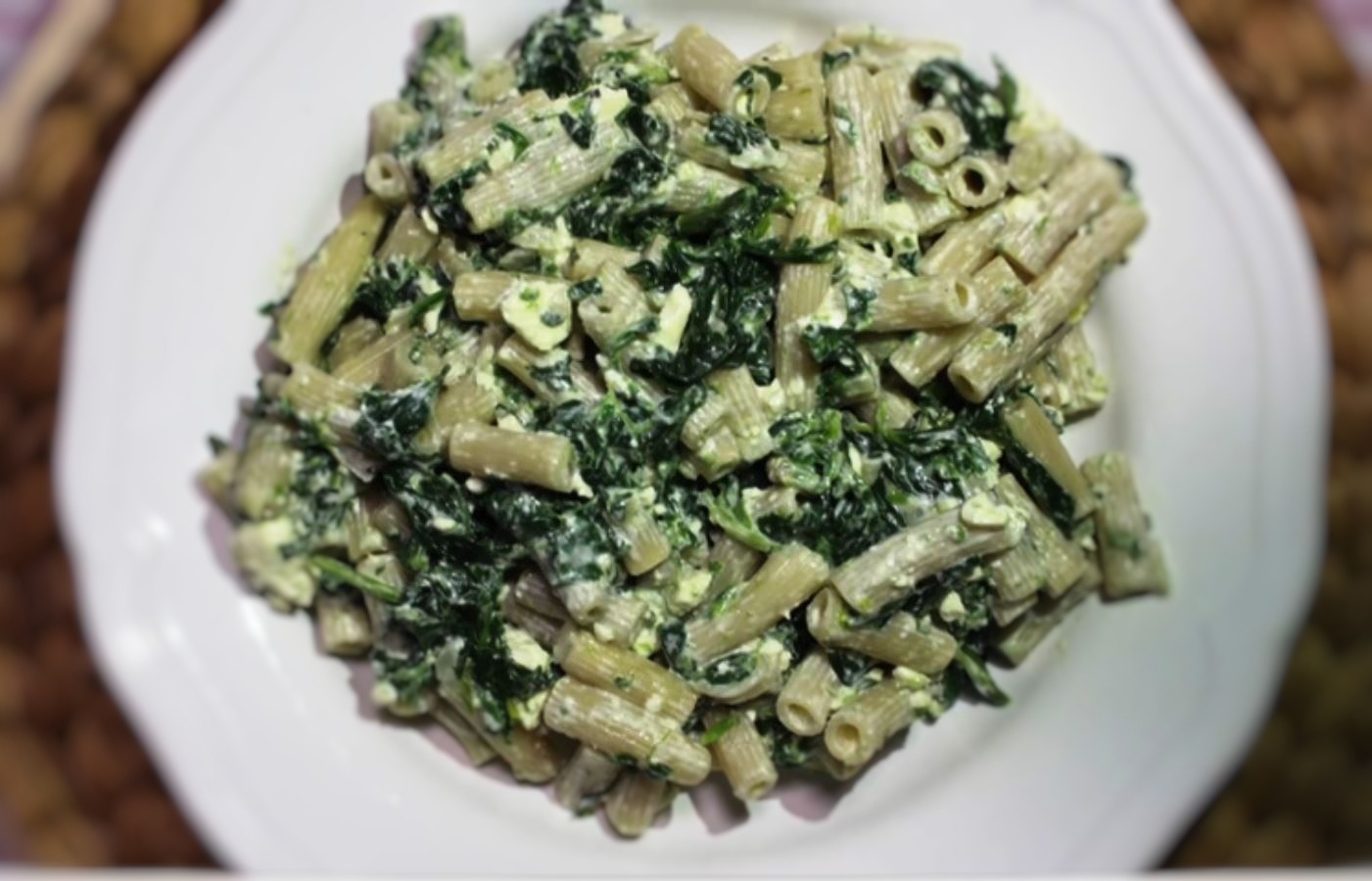 Εφόσον το σπανάκι έχει βράσει και μαραθεί προσθέτουμε στο τηγάνι τα ζυμαρικά και την