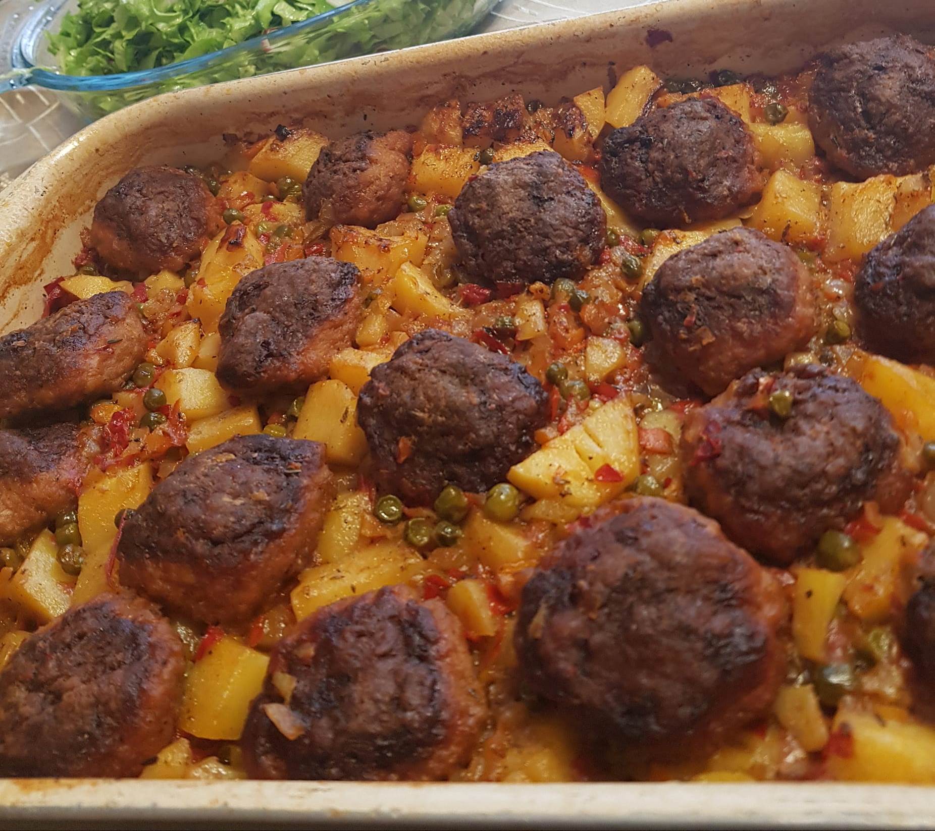 Ανοίγουμε το ταψί και ρίχνουμε τα κεφτεδάκια μέσα.