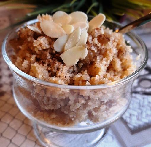Μετά από μισή ώρα, αφρατέψτε με ένα πιρούνι. Σερβίρετε κρύο, πασπαλισμένο με φιλέ αμυγδάλου και κανέλα.