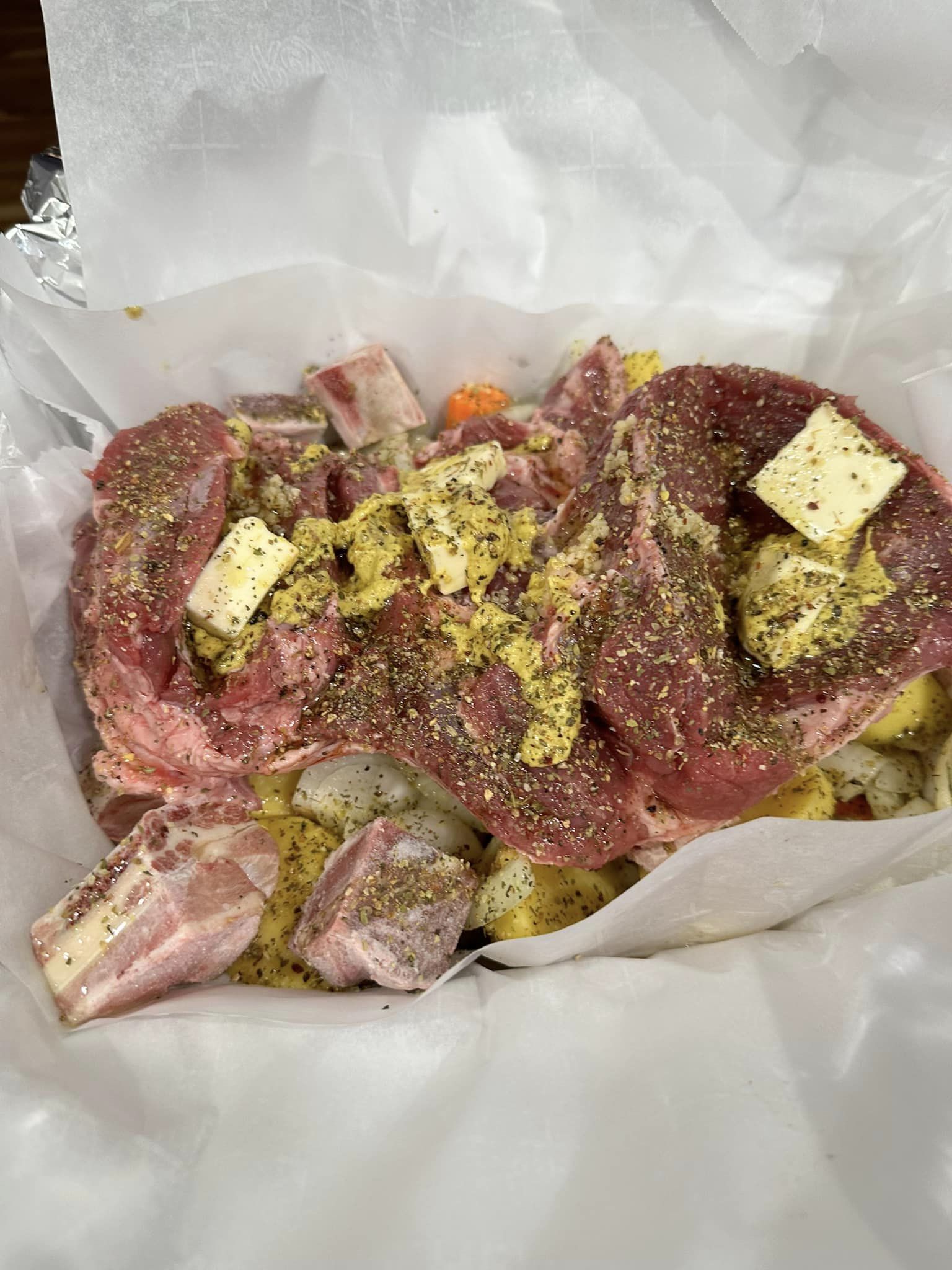 Πάνω από τα λαχανικά τακτοποιούμε αρνί και κατσίκι.Το αρνί μόνο αλείφουμε με ελαιόλαδο, μουστάρδα, πιπέρι, ρίγανη, θυμάρι και προσθέτουμε κομματάκια βούτυρο.