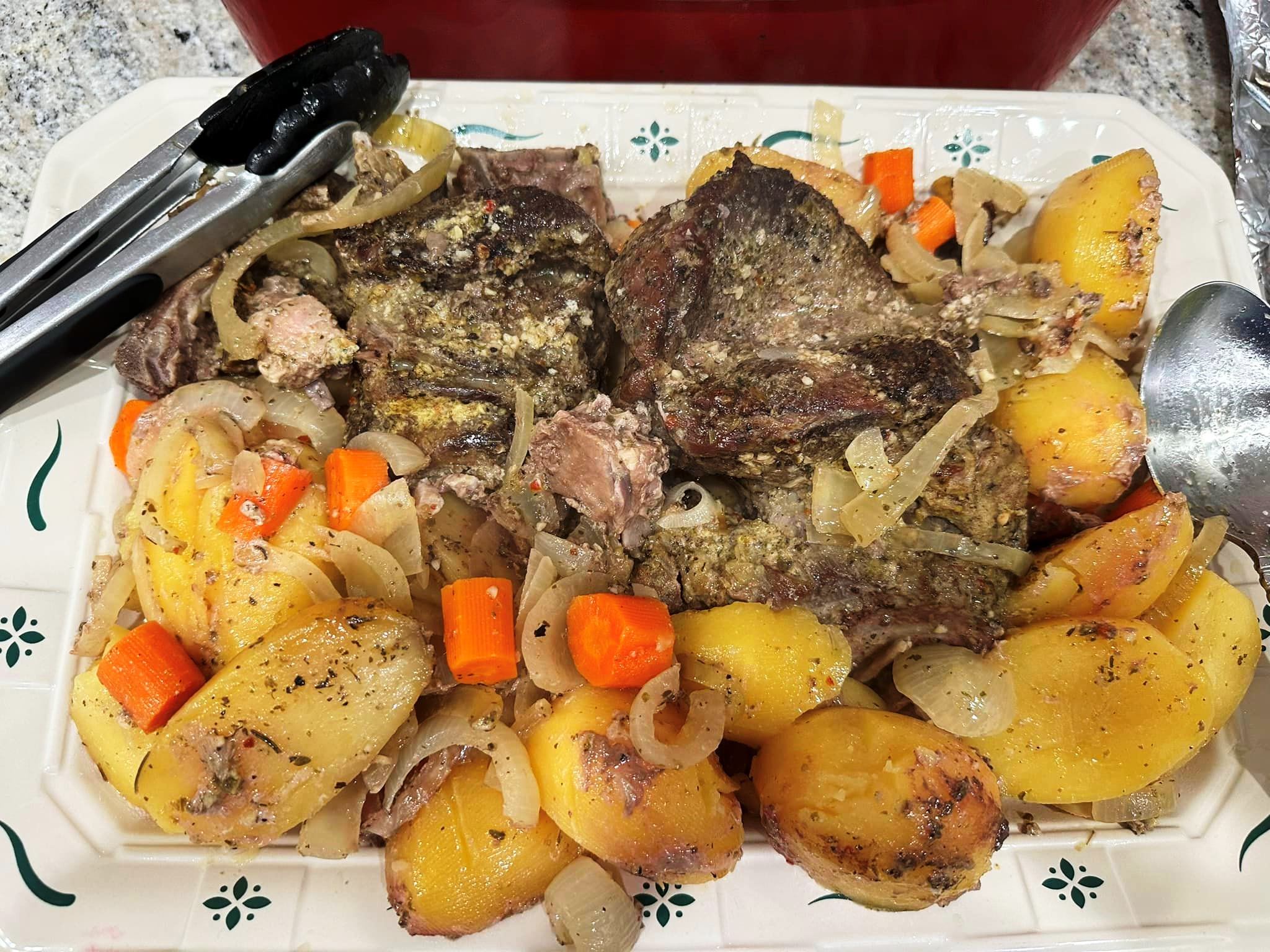 Μαρινάρετε το κρέας για 1-2 ώρες, αφαιρέστε και προσθέστε πατάτες κομμένες στα τεσσερα, κρεμμύδια, καρότα και 5-6 σκελίδες σκόρδο να μαριναριστούν και αυτά.
