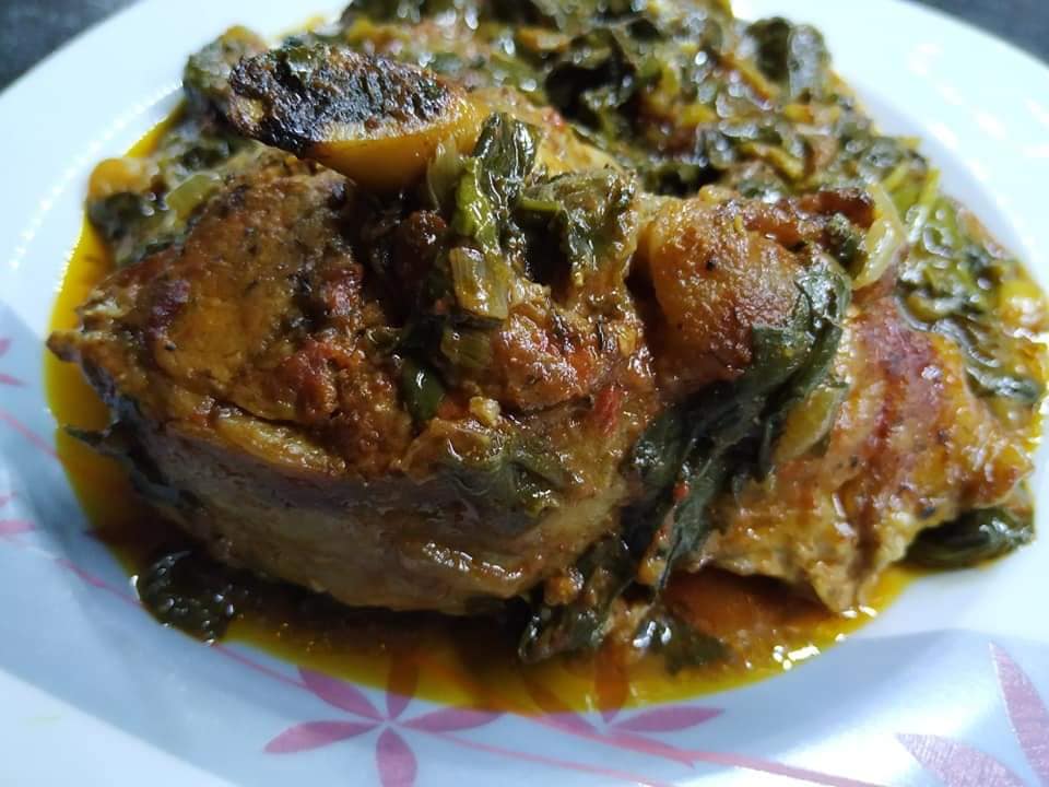 Και αφού βράσει βάζουμε τις μερίδες στο ταψί και το ζουμί απ’ το αρνί κι ανακατεύουμε ελαφρώς μέσα χόρτα και μερίδες ,να μοιραστούν οι γεύσεις να πάρει τ αρώματα!