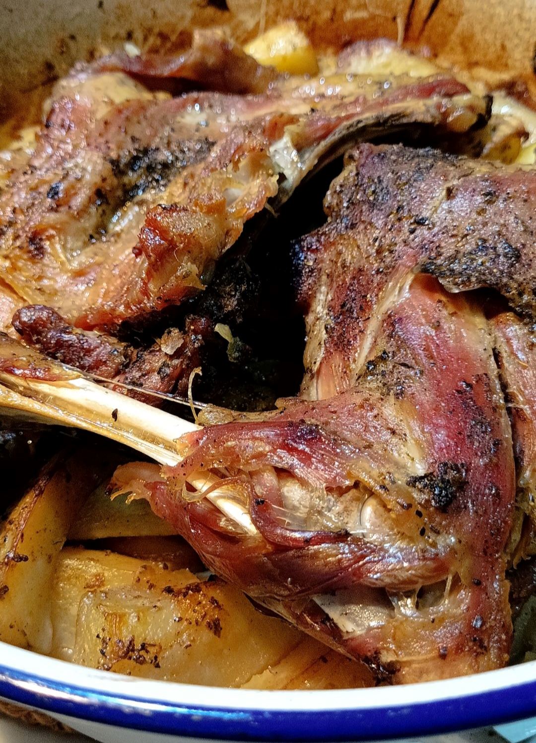 Τοποθετώ από επάνω το αρνάκι, σκεπάζω και ψήνω στους 170 βαθμούς στον αέρα για δύο ώρες περίπου.