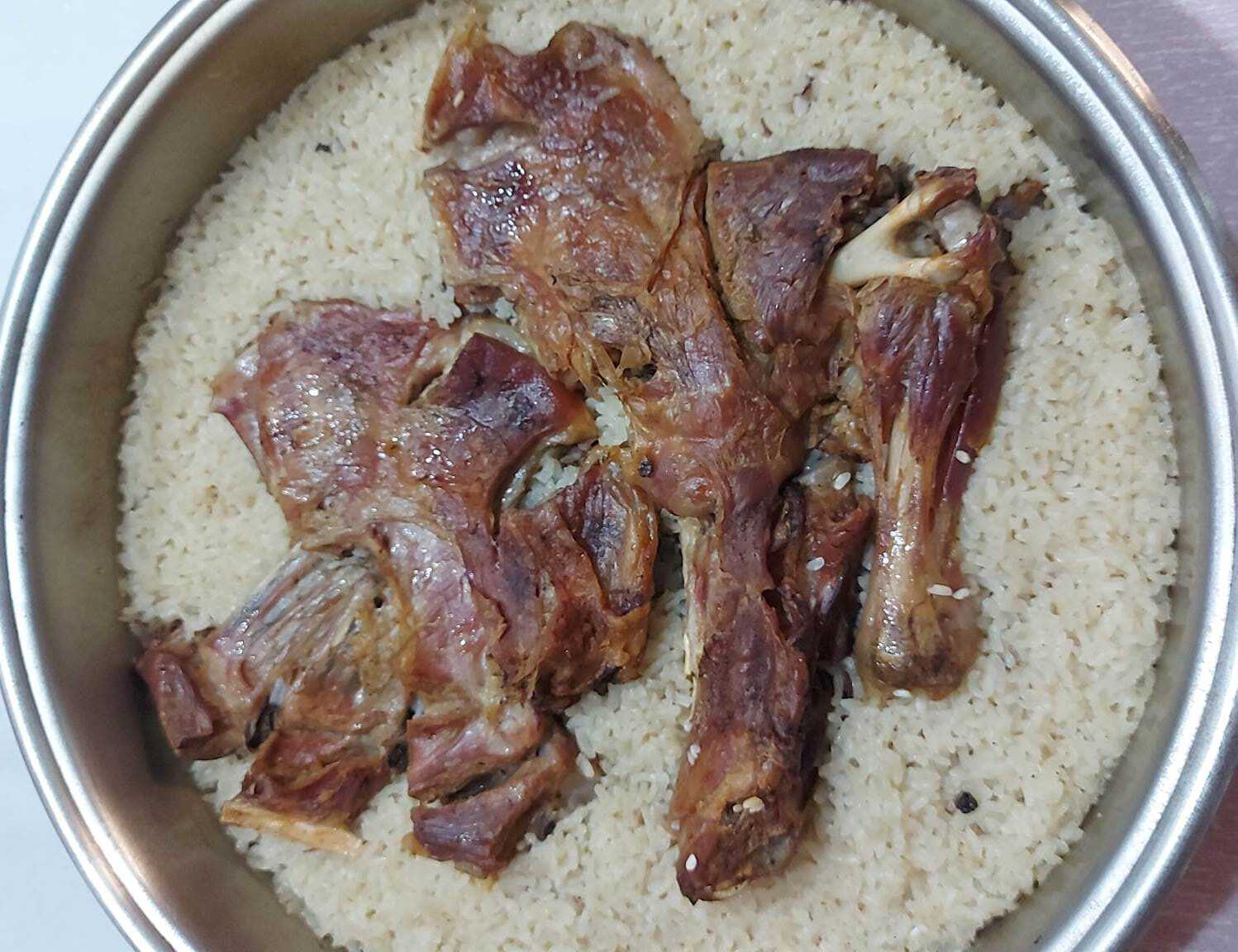 Πλενουμε το Ρύζι μέχρι να βγάλει καθαρό νερό και το σουρώνουμε..το αφεινουμε στην άκρη,πλένουμε καλά το κρέας και του κάνουμε ένα καλό μασάζ με αλάτι, πιπέρι και λαδάκι, το τοποθετούμε στο ταψί μαζί με το νερό και το βάζουμε στο φούρνο…εγώ στους 220 βαθμούς αντιστάσεις.Ψηνουμε μέχρι να εξαντληθεί το νεράκι και ροδίσει το κρέας..ρίχνουμε το ρύζι στο ταψί και προσθέτουμε το ανάλογο ζεστό νεράκι..1 προς δύο κούπες για την Καρολίνα…ψήνουμε για αλλά 15 με 20 λεπτά μέχρι να πιάσει κρουστά.. φρεσκοτριμμένο πιπερακι επάνω και σερβίρουμε με γιαουρτάκι πρόβειο με πέτσα