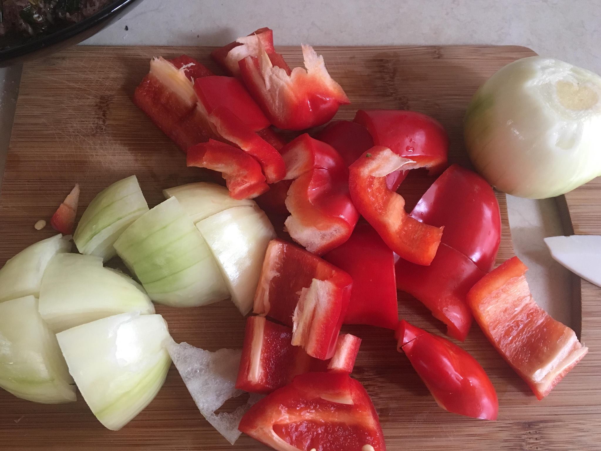 Στη συνέχεια κόβω πιπεριά και κρεμμύδι και τα περνάω στα σουβλάκια.