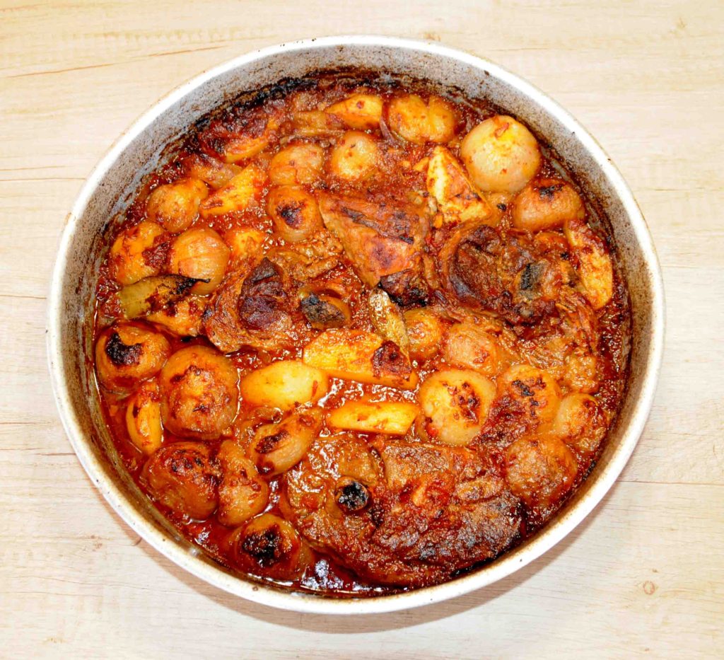 Τέλος προσθέτουμε στην γάστρα τα κρεμμυδάκια, τις πατάτες, το αλάτι, το πιπέρι, την πάπρικα, τα φύλλα δάφνης, τα γαρίφαλα, το ξύλο κανέλας, τα σκόρδα και το ξύδι.
