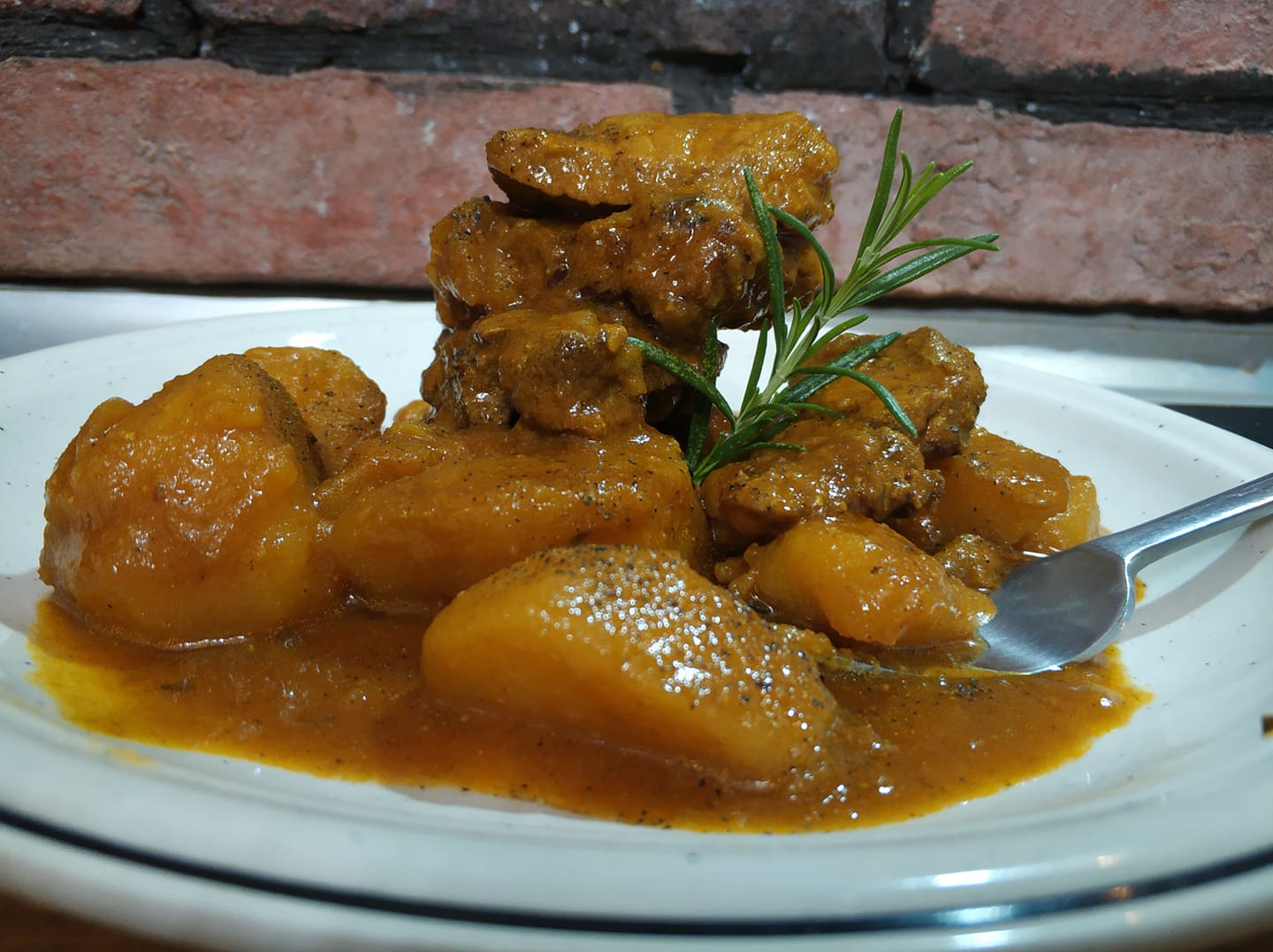 Στην ίδια κατσαρόλα, σοτάρετε το κρεμμύδι και μία σκελίδα σκόρδο. Προσθέστε με το κρεας, το τζίντζερ, τον κουρκουμά, το κόλιανδρο, το κύμινο και το δεντρολίβανο