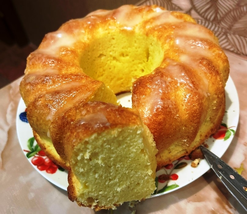 Ενώ το κέικ κρυώνει, φτιάχνουμε το γλάσο αναμειγνύοντας τη ζάχαρη άχνη με ζεστό νερό ή χυμό λεμονιού μέχρι να έχουμε μια παχύρρευστη σάλτσα.