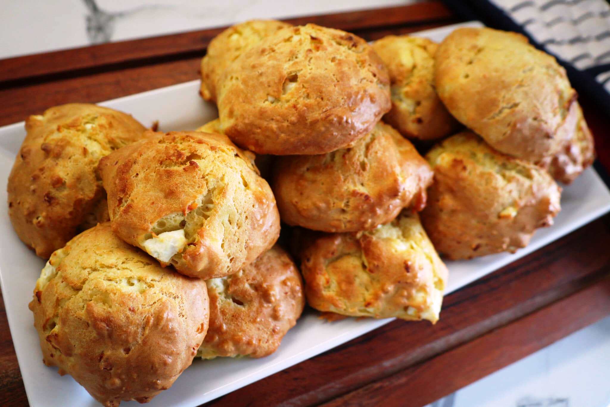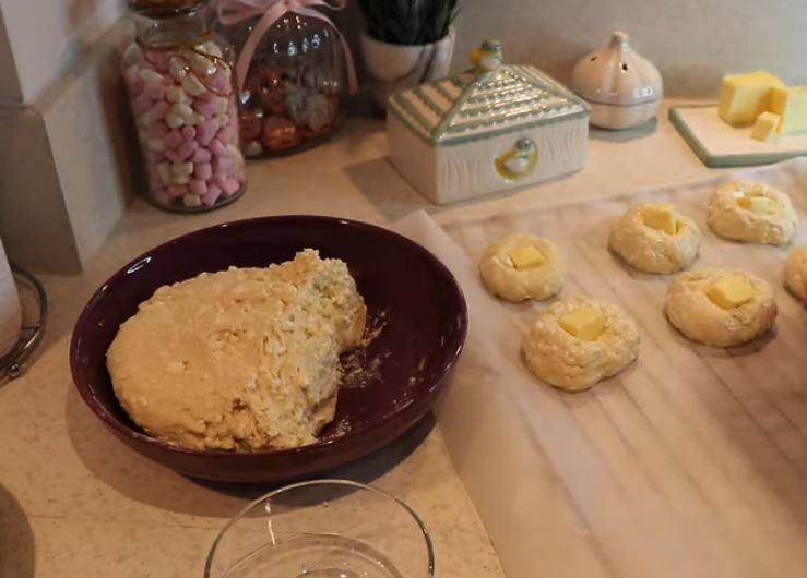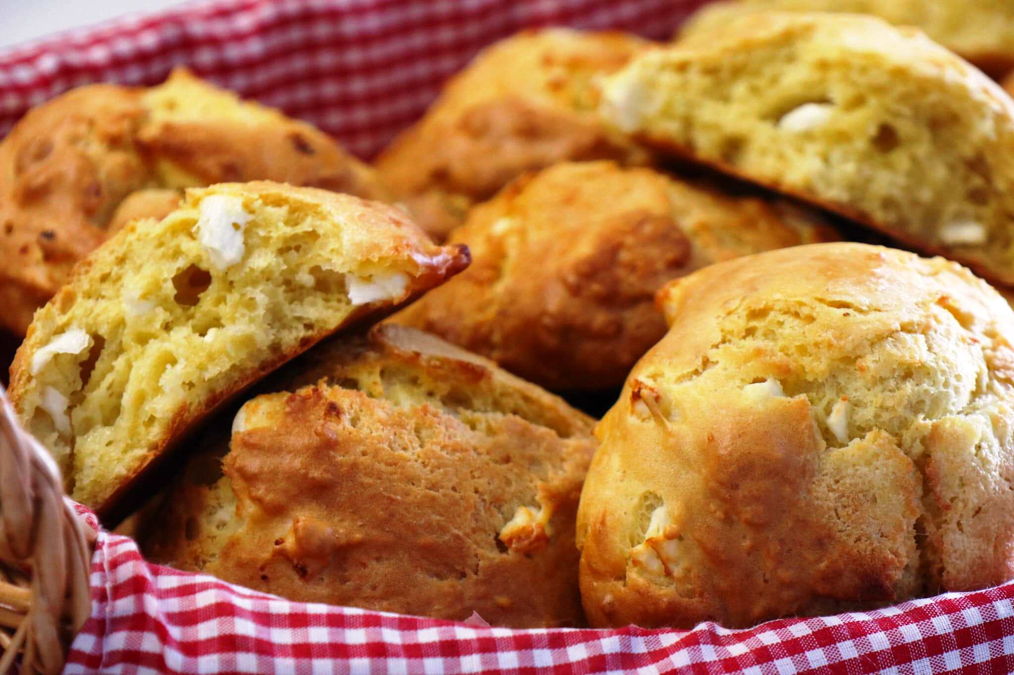 Το αλεύρι αναμιγνύεται με το αλάτι και την ζαχαρη, σχηματίζεται ένα πηγάδι, στο οποίο χύνεται το γιαούρτι με τη σόδα, τα αυγά, και το τριμμένο τυρί.