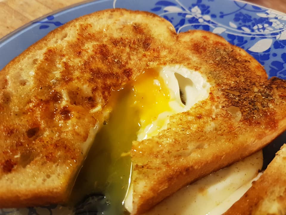 Έκοψα μια τρύπα με ένα φλιτζάνι σε μια φέτα ψωμί, το έβαλα σε ένα τηγάνι με 2-3 σταγόνες λάδι (ελαιόλαδο) και σπάω προσεκτικά ένα αυγό μέσα στο ψωμάκι. Βάζω ένα καπάκι ένα άλλο ψωμακι και μετά από 2-3 λεπτά το αναποδογυρίζω προσεκτικά.