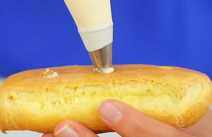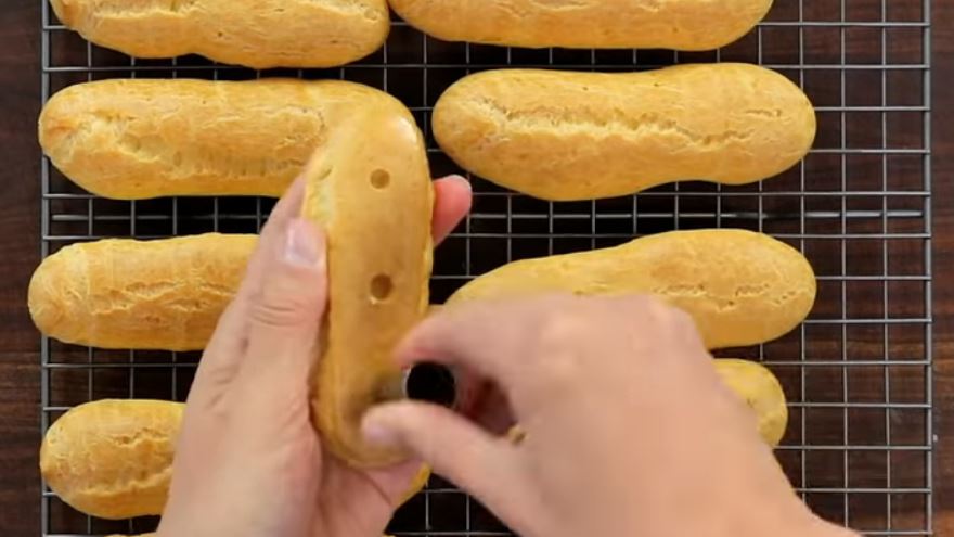 Με μια μικρή άκρη μιας τσάντας ζαχαροπλαστικής, ανοίγετε 2-3 τρύπες από το κάτω μέρος κάθε ζύμης εκλέρ. Βάλτε την κρέμα μέσα στις τρύπες που ανοίξατε πριν στην βάση κάθε εκλέρ, πέρνωντας με το δάχτυλο την περίσσεια.