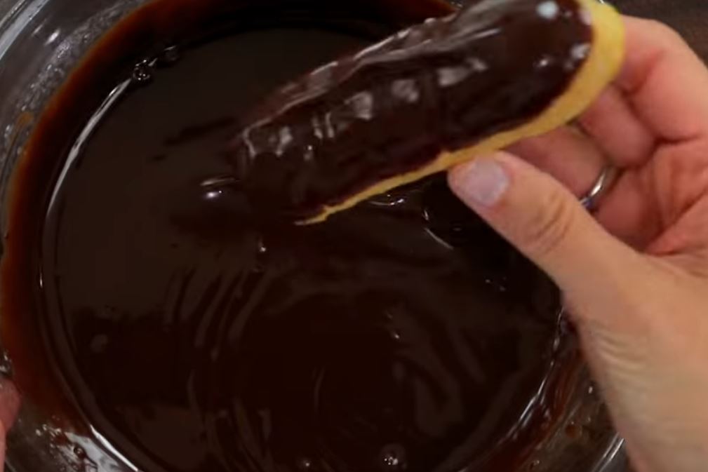 Βυθίστε το επάνω μισό των γεμισμένων και κρύων εκλαΐρ στην  σοκολάτα, επιτρέποντας την περίσσεια να στάξει.