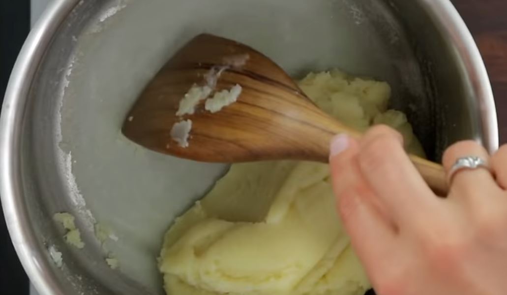 Οταν το αλεύρι ενσωματωθεί, τοποθετείται πίσω σε μέτρια φωτιά περίπου 1 1/2 έως 2 λεπτά ανακατεύοντας συνεχώς (για να απελευθερώσει επιπλέον υγρασία και μερικώς μαγειρευτεί το αλεύρι), ή έως ότου η ζύμη έρθει μαζί σε μια μαλακή σφαίρα και σχηματίζεται ένα λεπτό φιλμ στον πυθμένα του τηγανιού.