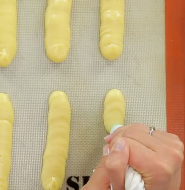 Σχηματίστε με την κρέμα σωλήνες πάνω σε ένα φύλλο ψησίματος χρησιμοποιώντας μία σακούλα ζαχαροπλαστικής με  1,5 εκ στρογγυλή άκρη. Σχηματίστε 18 – 20 σωλήνες του εκλέρ  (μήκος 12 εκ και πλάτος 2 εκ), διατηρώντας τα μεταξύ τους 3 εκ.