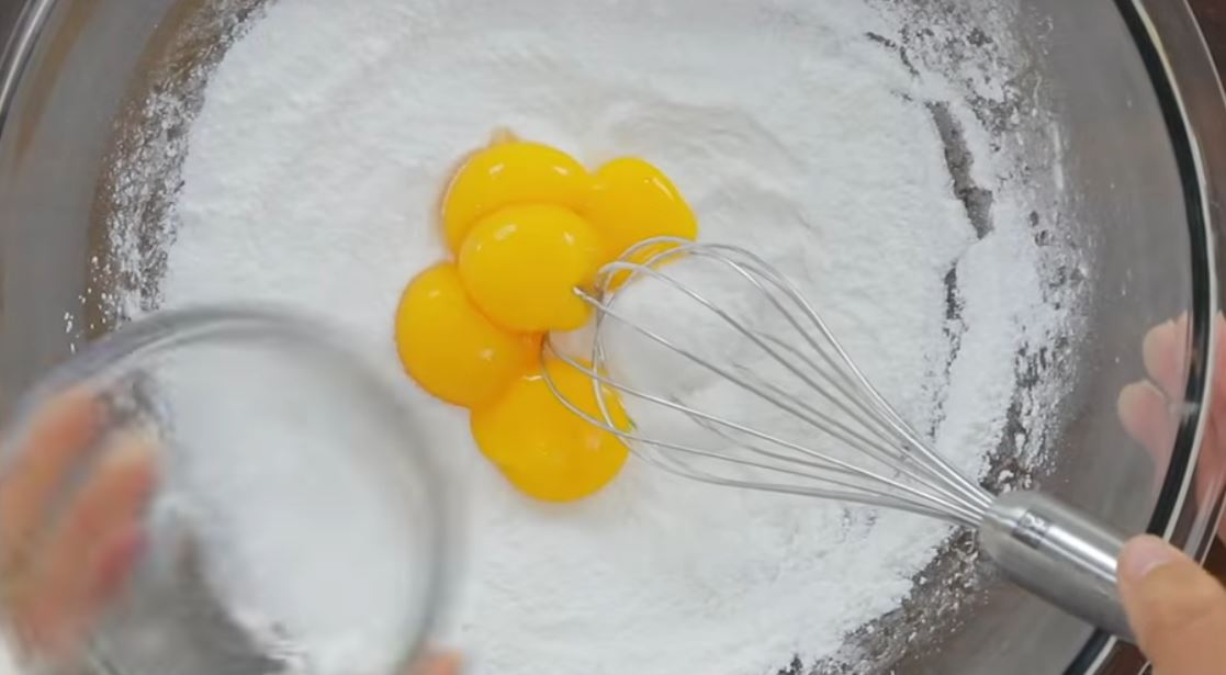 Σε ένα ξεχωριστό μεγάλο μπολ, χτυπήστε μαζί 3/4 φλιτζάνι ζάχαρη, 1/4 φλιτζάνι καλαμποκιού άμυλο και 1 πρέζα αλάτι. Προσθέστε 4 κρόκους αυγών και χτυπήστε μέχρι να μαλακώσουν, και να κρεμώσουν θα χρειαστούν μερικά λεπτά, και θα είναι έτοιμη.