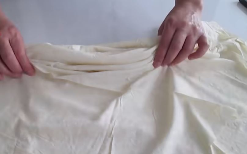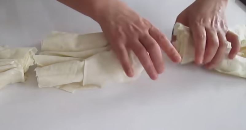 Βάζουμε τα 3 φύλλα το ένα πάνω στο άλλο και τα σουρώνουμε και τα κόβουμε σε 3 ισα μερη