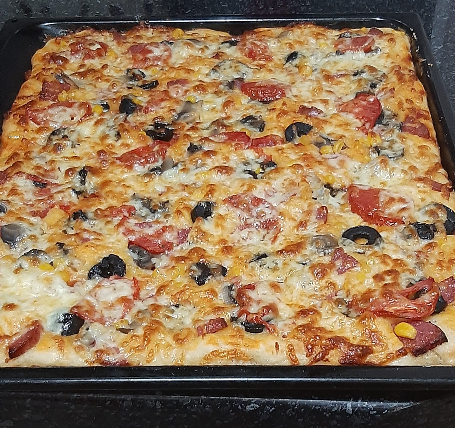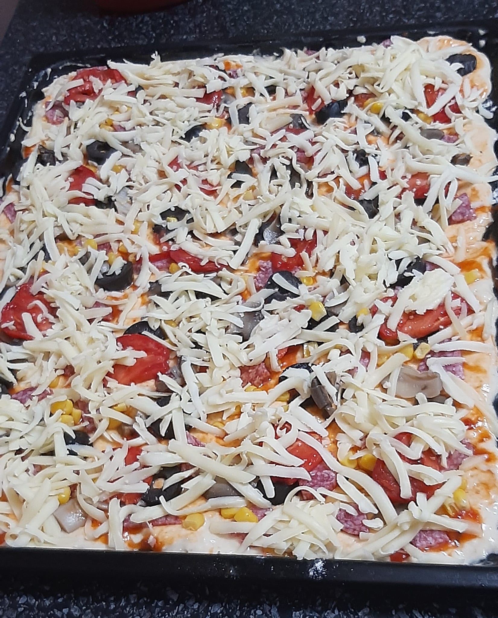 Αλείφουμε ένα ταψί με λάδι και πασπαλίζουμε με αλεύρι. Απλώνουμε το μείγμα και το αφήνουμε να σταθεί για περίπου 20 λεπτά. Στη συνέχεια αλείφουμε με σάλτσα ντομάτας ή κέτσαπ.