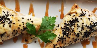 Πασπαλίζουμε με μαυρο σουσάμι και ψήνουμε στους 180ºC για 15 λεπτά.