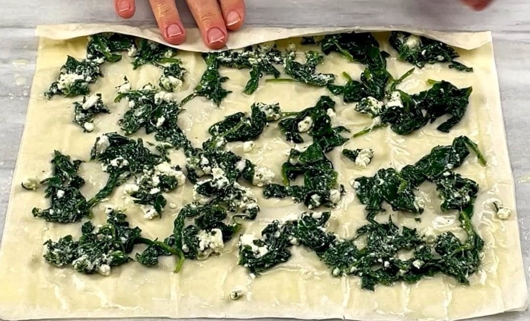 Ανακατεύουμε τη φέτα και το μαγειρεμένο σπανάκι και τοποθετούμε πάνω από το φύλλο.