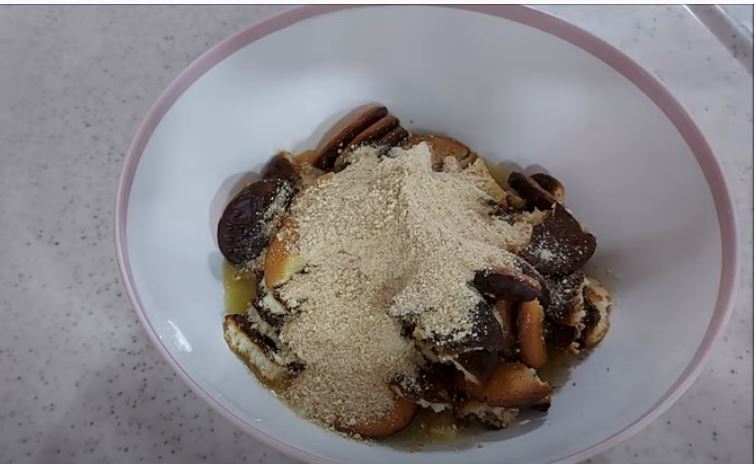 Σε ένα μπολ λιώνουμε με ένα πιρούνι δύο μπανάνες προσθέτουμε το τριμμένο καρύδι τα μπισκότα σοκολάτας το λιωμένο βούτυρο και 100 γραμμάρια τριμμένο μπισκότο πτι μπερ.