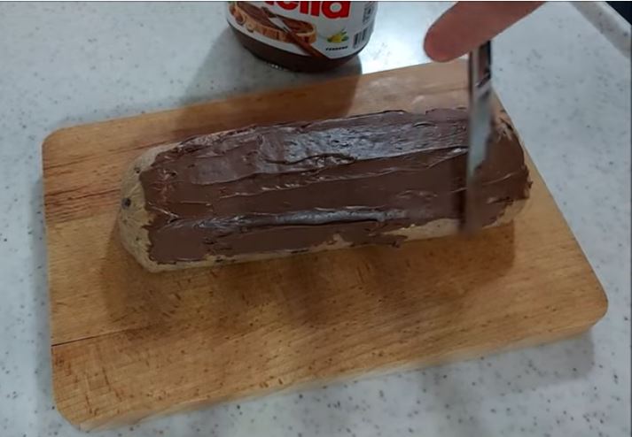 Μετά την αφαιρούμε από το ψυγείο για αλείφουμε όλο τον κορμό με νουτέλα.