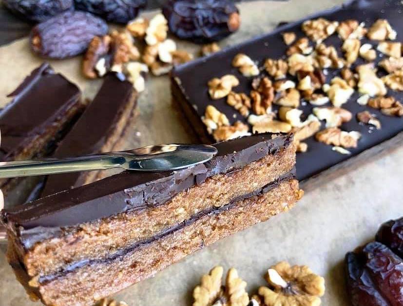 Αφαιρέστε από το καλούπι και κόψτε στα μισά σε δύο ίσα μέρη. Επιστρέψτε το πρώτο μέρος στην φόρμα, κάντε ένα χώρισμα από χαρτί ψησίματος. Λιώστε τη σοκολάτα με το λάδι καρύδας. Ρίχνουμε τη μισή σοκολάτα στο πρώτο μέρος της βάσης, κρυώνουμε στο ψυγείο για περίπου 15 λεπτά, βάζουμε το δεύτερο μέρος της βάσης και ρίχνουμε το υπόλοιπο μέρος της σοκολάτας. Γαρνίρετε με καρύδια, βάλτε για λίγα λεπτά στο ψυγείο και μετά κόψτε και