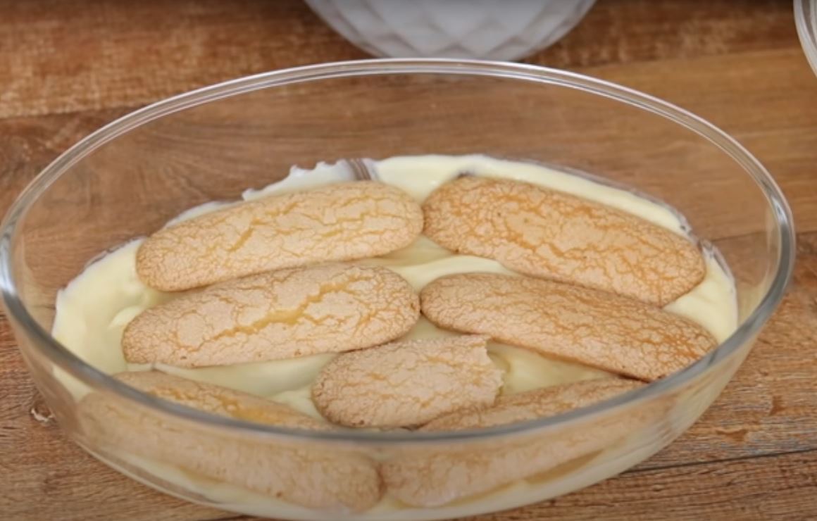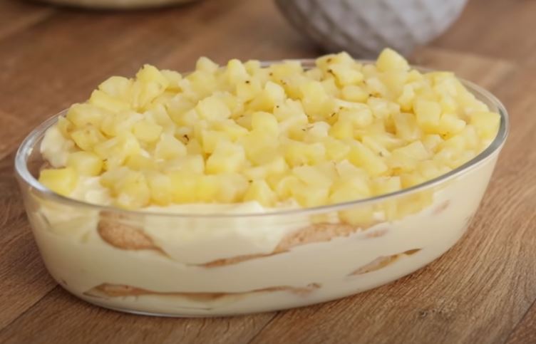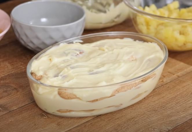 Φτιάξτε ένα στρώμα κρέμας στο κάτω μέρος ενός πυρεξ και, στη συνέχεια, φτιάξτε ένα στρώμα με σαβαγιαρ βαπτιζοντας τα πρώτα στο σιρόπι που λαμβάνεται από τον ανανά.