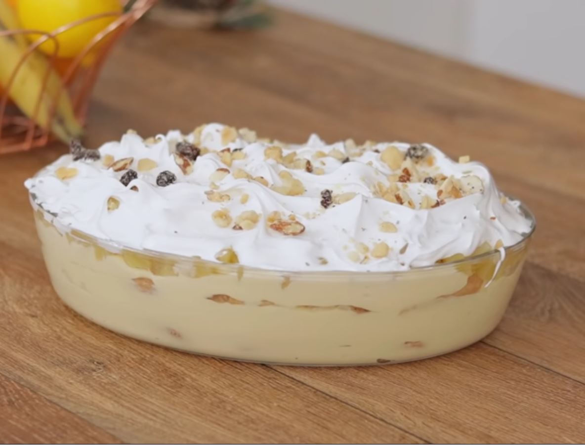 Τελειώστε απλώνοντας τη μαρέγκα πάνω από το επιδόρπιο και απλώστε γρήγορα με ένα κουτάλι για να δημιουργήσετε αυτό το ανατριχιαστικό αποτέλεσμα, στη συνέχεια διακοσμήστε με τριμμένο καρύδι και σταφίδες.