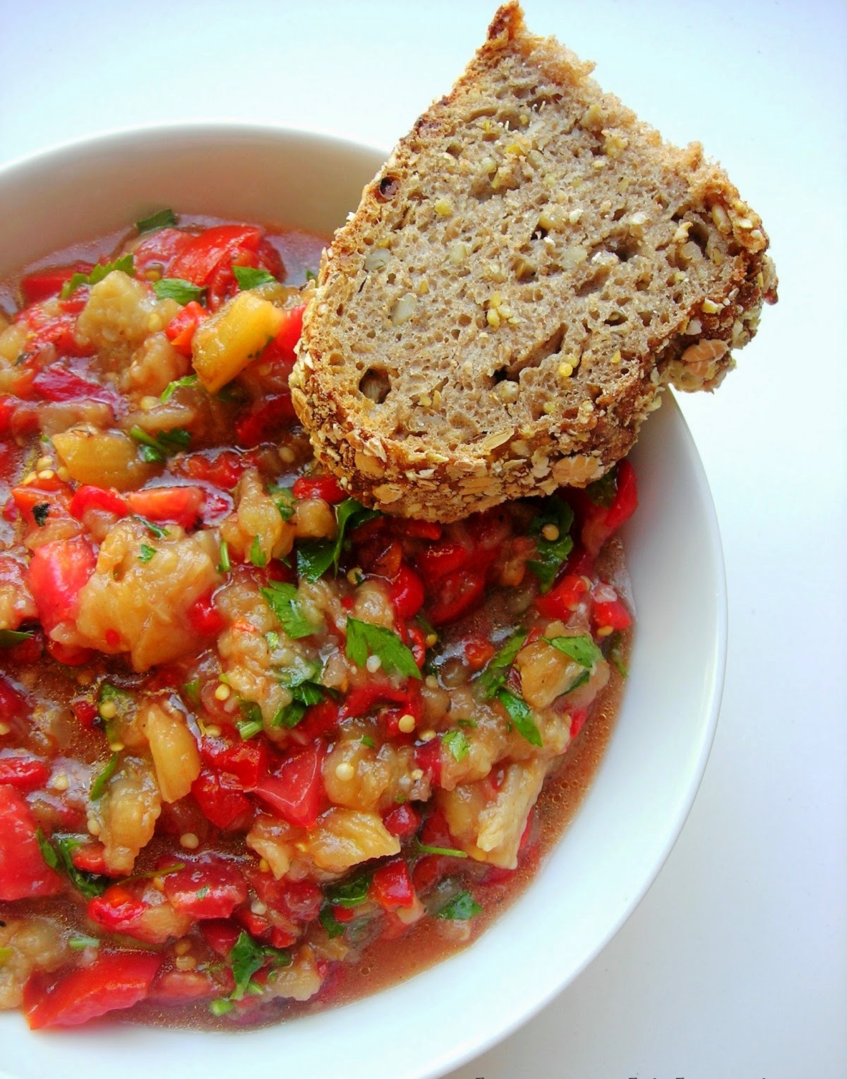 -Σε ένα μπολ αναμειγνύεται το σκόρδο, μελιτζάνες, πιπεριές, ντομάτες και μαϊντανό.
