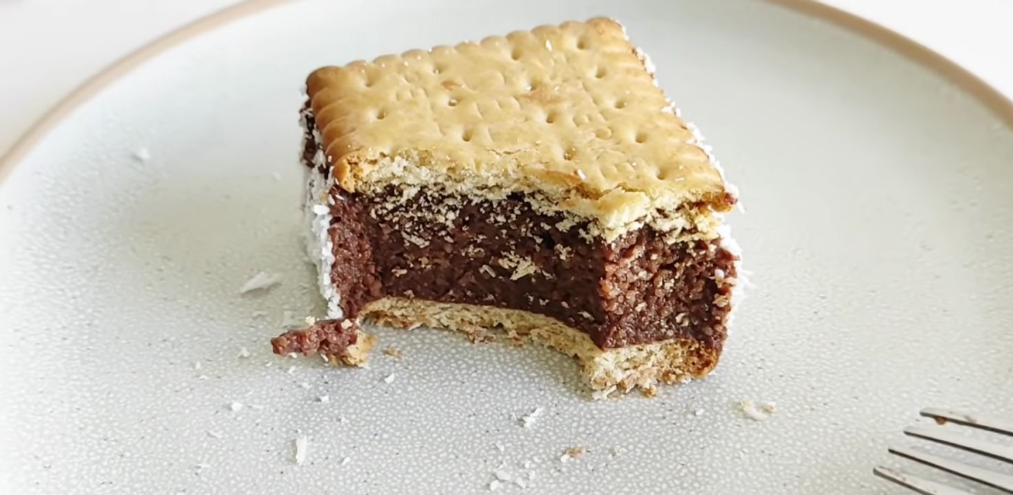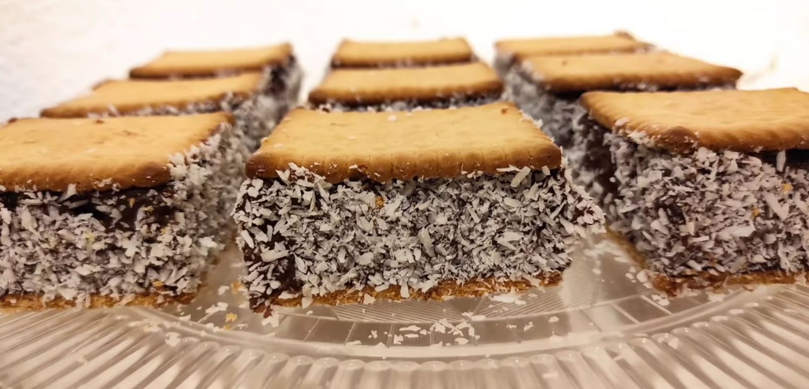 Αφαιρέστε το από τη φωτιά και αφήστε το να κρυώσει ελαφρώς. Παιρνουμε μια φόρμα πασπαλίζουμε με καρύδα έτσι ώστε να μην κολλήσουν τα μπισκότα και αρχίζουμε και στρώνουμε τα μπισκότα στη βάση να την καλύψουμε όλη.