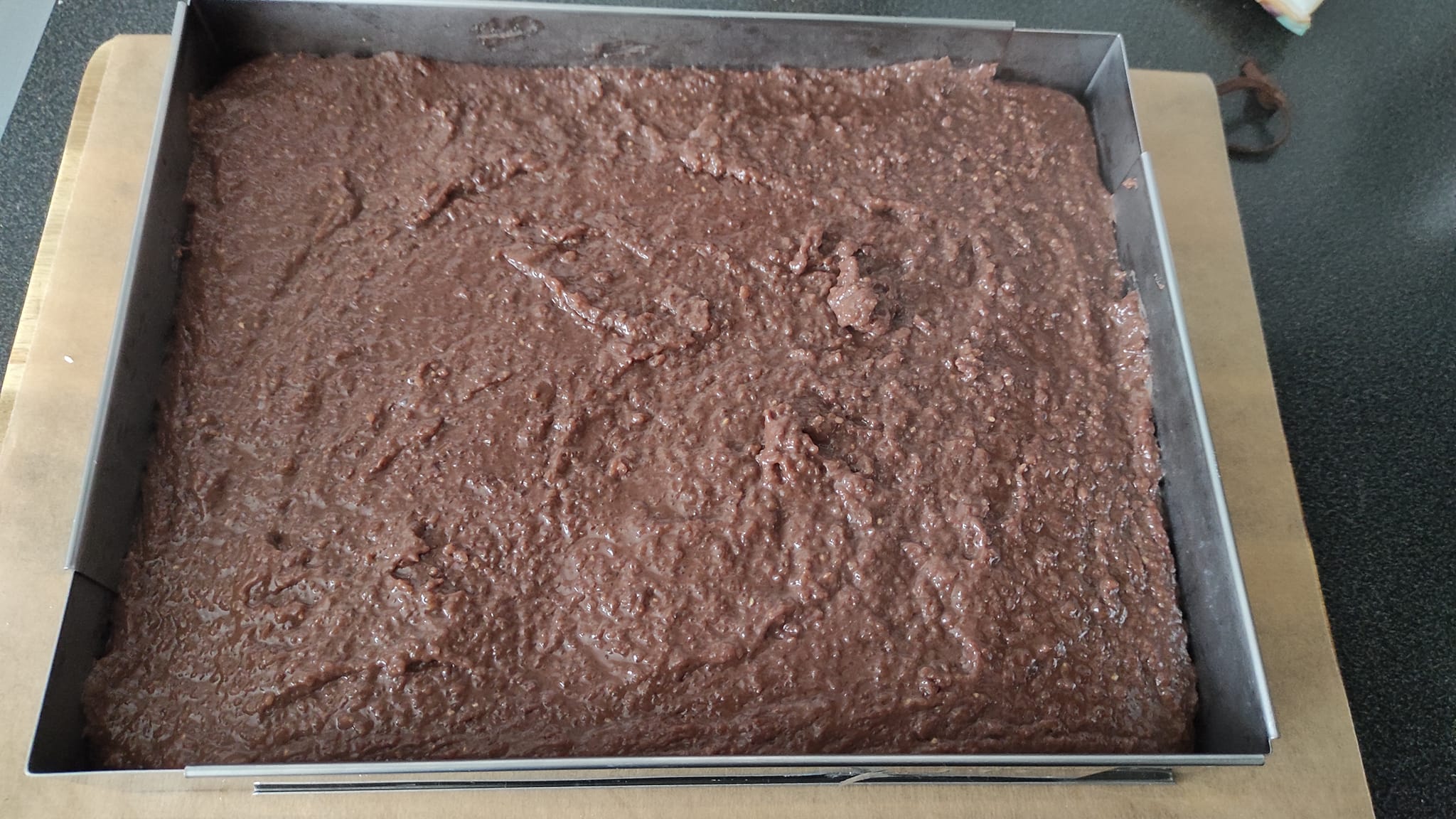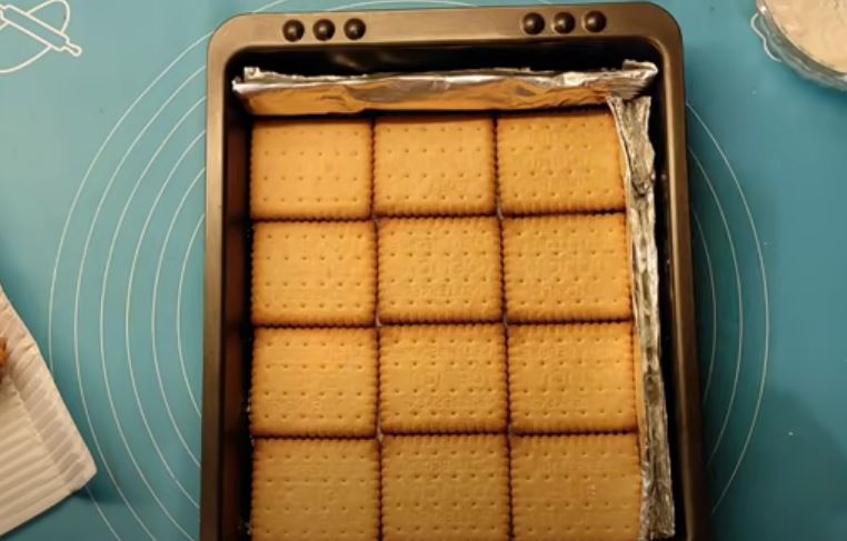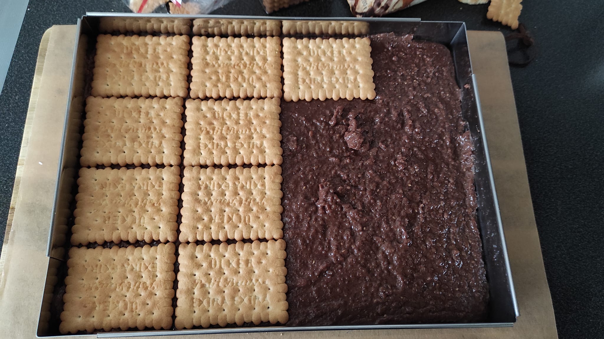 Αδειάζουμε όλο το μείγμα επάνω από τα μπισκότα το ισιώνουμε και από πάνω στρώνουμε μπισκότα να το καλύψουμε εντελώς.