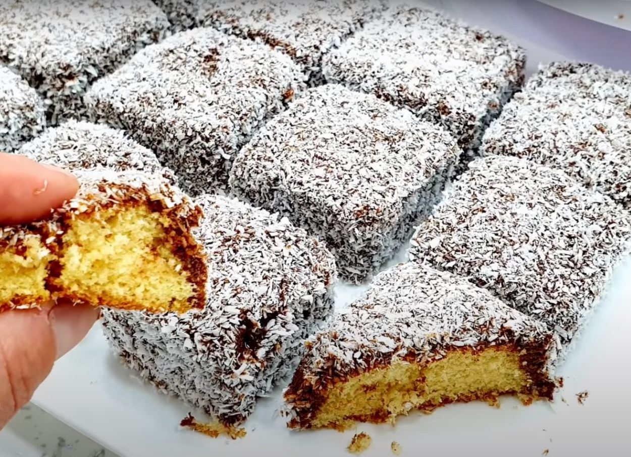 Βουτάμε ένα ένα τα κομμάτια του κέικ στην σοκολάτα με την βοήθεια ενός πιρουνιού και μετα το περνάμε και από την τριμμένη καρύδα.