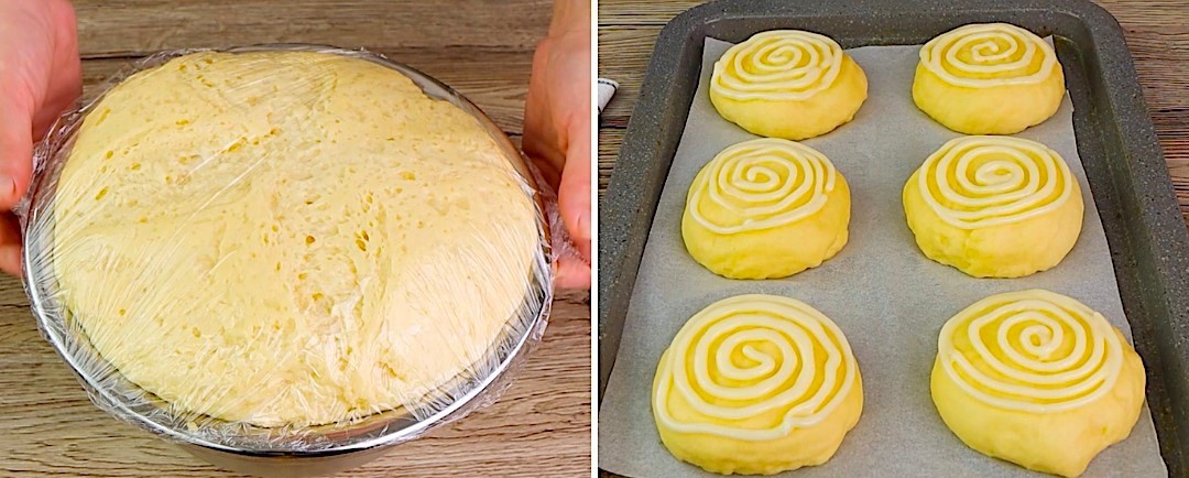 Πιέζετε με τα χέρια σας και σχηματιζετε ψωμάκια και προσθέτετε τη γέμιση από πάνω με μια σακούλα ζαχαροπλασικής με λεπτό στομιο κανοντας ένα σαλιγκαρι