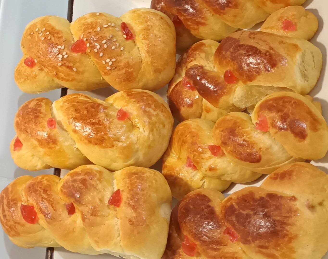 Τα αφήνω να φουσκώσουν λίγο, τα αλείφω με κροκάδι αραιωμένο με λίγο λάδι και λίγο γάλα και τα στολίζω με αμύγδαλα φιλέ ή με κερασάκια γλασέ σε κομματάκια. Τέλος, τα ψήνω στους 190 βαθμούς πάνω κάτω θέρμανση, μέχρι να χρυσίσουν.