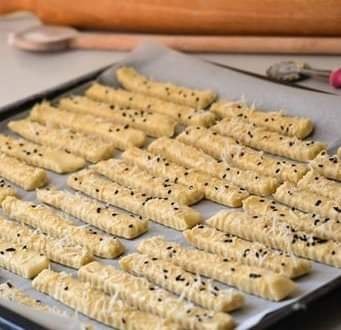 Αρχικά το αλείφουμε με κρόκο αυγού ανακατεμένο με λίγο λάδι και το πασπαλίζουμε με χοντρό ή απλό αλάτι και μόνο μετά το κόβουμε στα μπαστουνάκια που θέλουμε, τα δικά μου είναι περίπου 6x2cm.