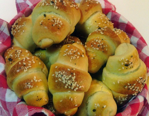Στην αρχή κάθε τριγώνου βάλτε μια κουταλιά του μείγματος αλατιού και τυλίξτε σαν κρουσανάκια .