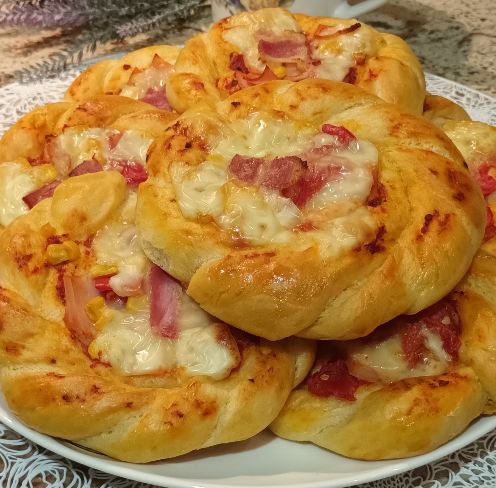 Αφού τα πιτσάκια μας είναι έτοιμα, τα αφήνουμε να φουσκώσουν λίγο ακόμα. Τώρα είναι η ώρα να τα γεμίσουμε! Βάζουμε μισό κουταλάκι του γλυκού σάλτσα ντομάτας, τα υλικά της γέμισης, το τυρί και τέλος το μπέικον. Για να αποκτήσουν ένα όμορφο χρυσαφένιο χρώμα, τα αλείφουμε με κρόκο αυγού αραιωμένο με λίγο νερό. Τέλος, τα ψήνουμε σε προθερμασμένο φούρνο στους 190-200°C με πάνω-κάτω θέρμανση, μέχρι να ροδίσουν. Προσέχουμε να μην τα παραψήσουμε, ώστε να παραμείνουν μαλακά και αφράτα.