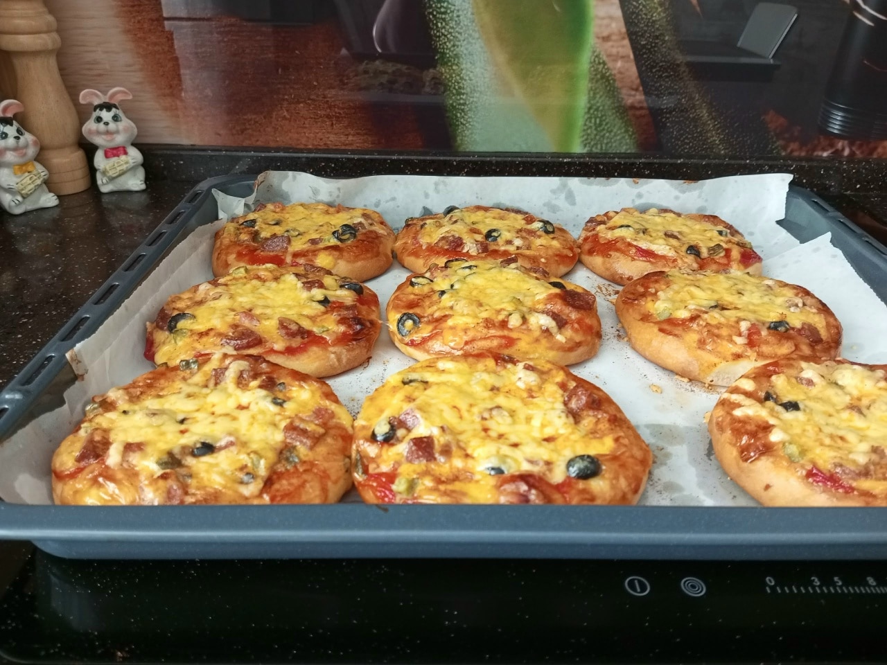 Ψήνουμε σε προθερμανμένο φούρνο στους 180°C για 20-25 λεπτά μέχρι να ροδίσουν καλά τα πιτσάκια μας και να λιώσει το τυρί.