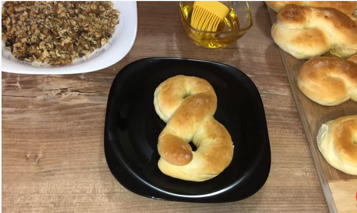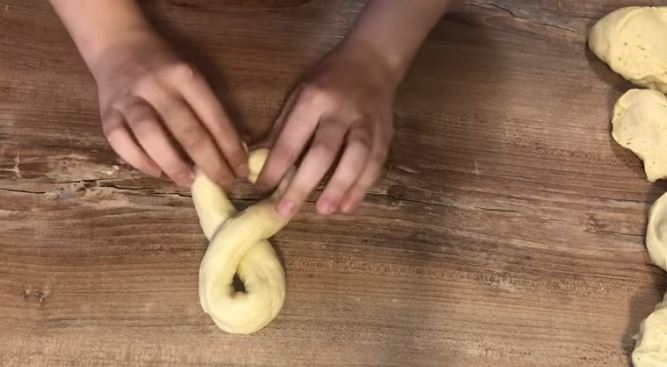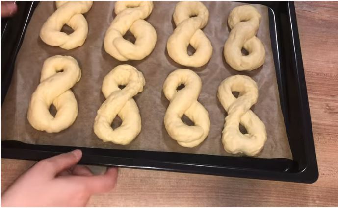 Παίρνουμε το κάθε κομμάτι και το πλάθουμε σε ένα μακρύ κορδόνι. Του δίνουμε το σχήμα του 8 και το βάζουμε στο ταψί στο οποίο έχουμε βάλει αντικολλητικό χαρτί.