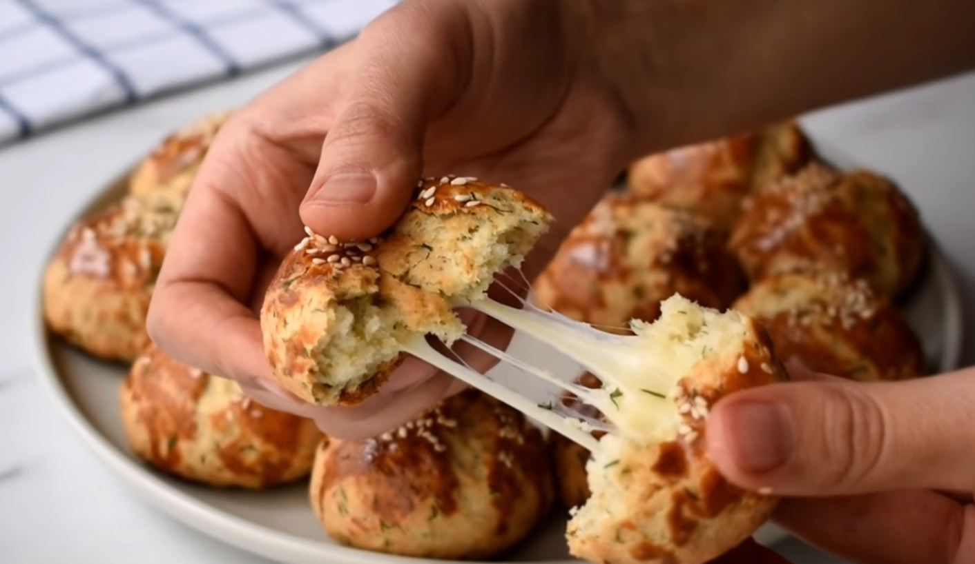 Όταν τελειώσουμε παίρνουμε ένα ένα μπαλάκι το πιέζουμε με τα δάχτυλα μας ν ανοίξει και βάζουμε στο κέντρο ένα μικρό κομμάτι τυριού.